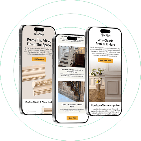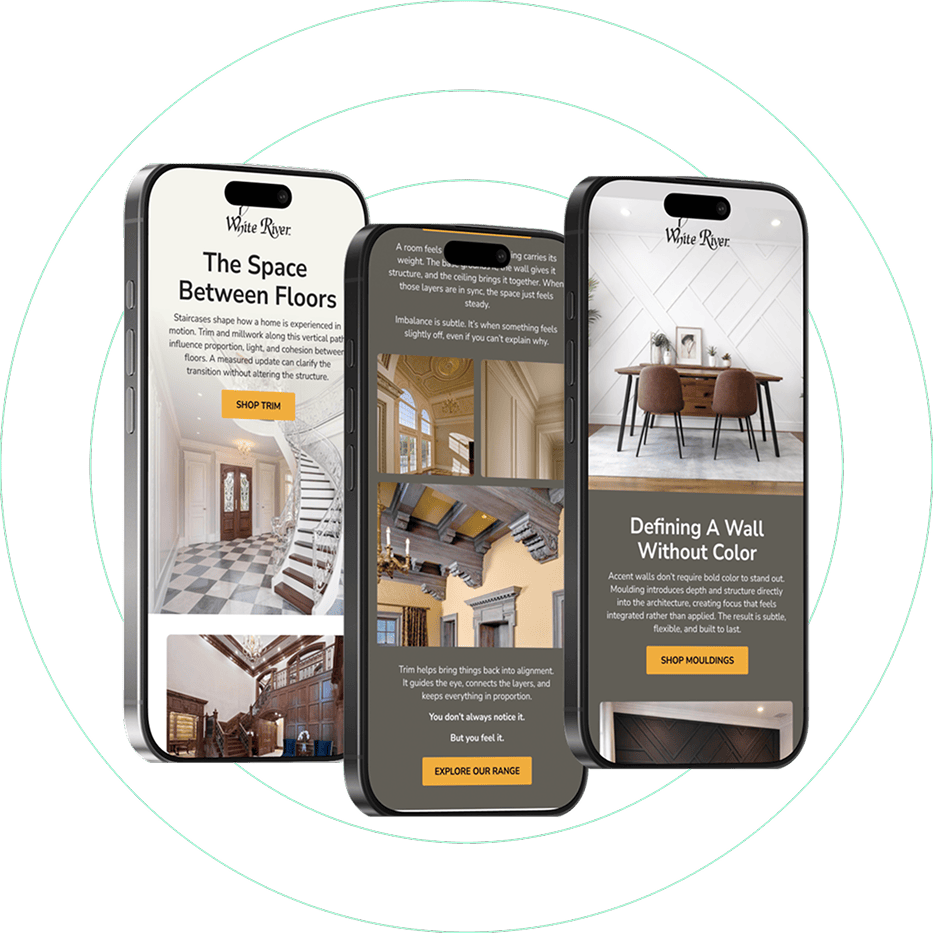 What their email programme needed to do was reflect that same standard of craft. Not a catalogue blast. Not a discount rotation. A content-led strategy that educated a design-literate audience, established White River as the definitive authority on architectural millwork, and made every send worth opening.